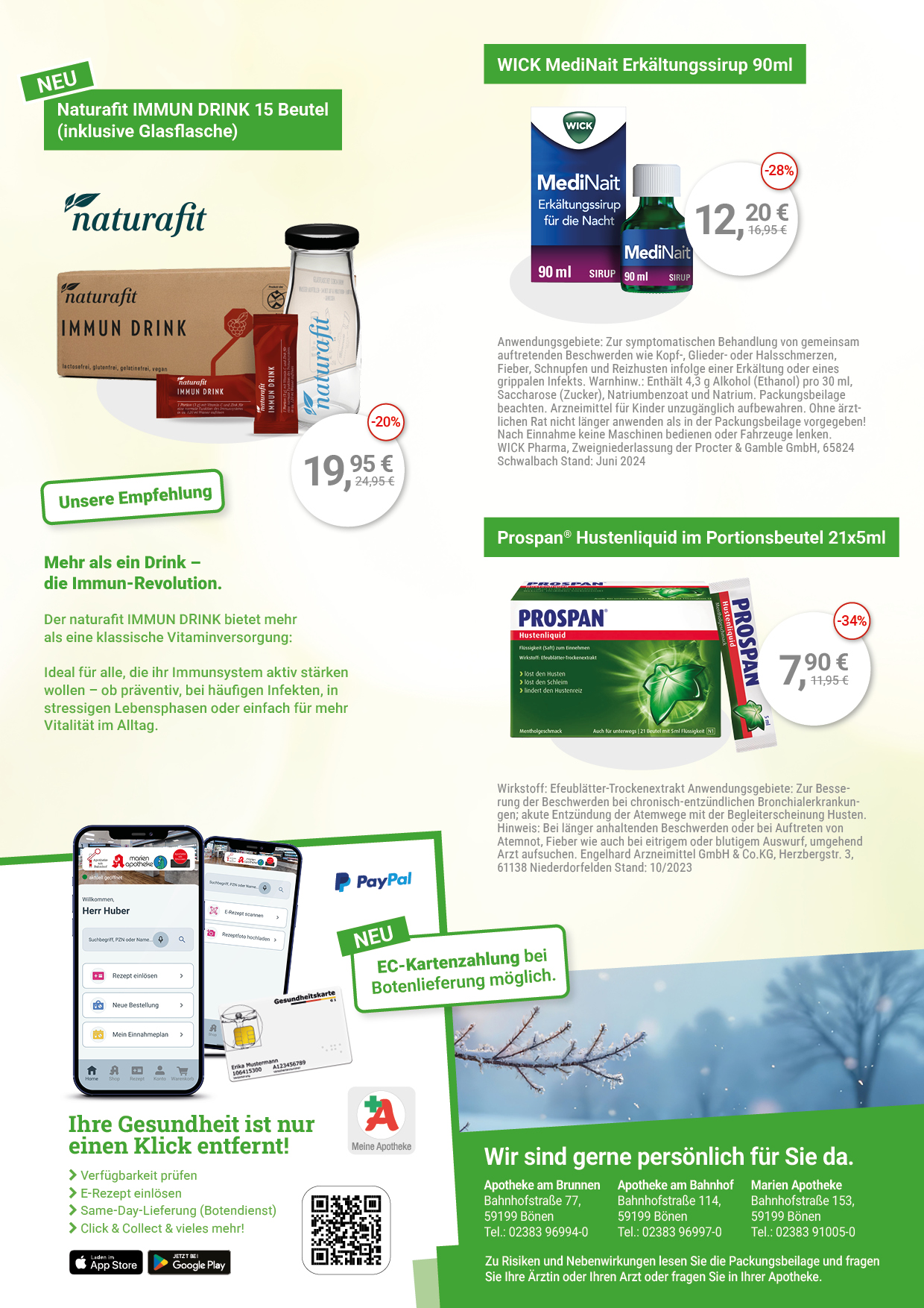 Unsere Apotheke steht nicht nur als vertrauenswürdiger Ort in Ihrer Nachbarschaft, sondern auch als digitaler Begleiter zur Verfügung. Vor Ort bieten wir Ihnen eine persönliche Beratung und Betreuung an. Online stehen wir Ihnen mit derselben Expertise und Fürsorge zur Verfügung. In beiden Dimensionen, physisch und digital, bleiben wir Ihr verlässlicher Partner in allen Gesundheitsfragen.